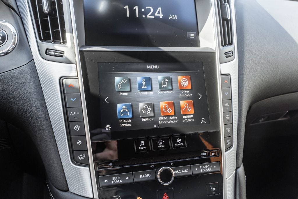 - Radio: INFINITI InTouch w/AM/FM/HD/CD -inc: 6 speakers, dual HD display system, Apple CarPlay, Siri Eyes Free, Android Auto, Bluetooth® hands-free phone system w/hand-free text messaging assistant, steaming audio via Bluetooth®, 2 illuminated USB connection ports (1 type A, 1 type C), auxiliary audio input, SiriusXM radio w/advanced audio features w/3-month complimentary trial and Wi-Fi hotspot